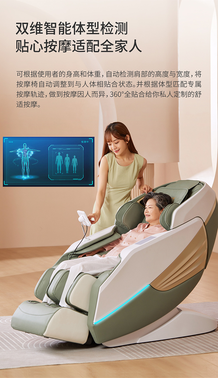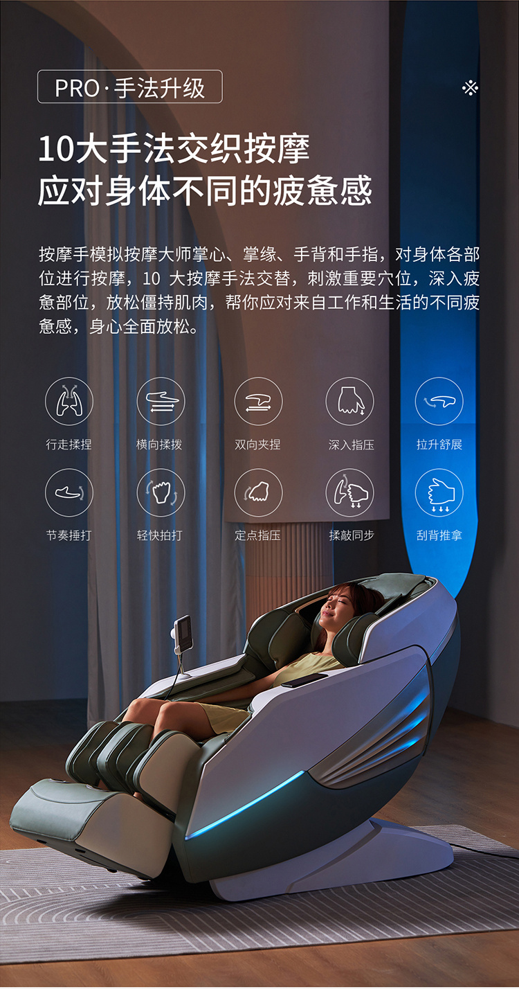 锐珀尔集十余年技术积累,倾力打造锐珀尔新款按摩椅4D穴感总裁椅,拥有全新的AI智能语音,小腿温热揉搓、脚底震动、4D机械手等全新功能创新,智能健康体测,可以检测血氧、心率、微循环等数值,通过大数据分析,给您提供合理的改善方法,时刻关注您的健康状况;超大液晶智能触控,专为总裁量身打造的特色按摩程序,20分钟快速补充精力,多种按摩程序,满足全家人的需求。